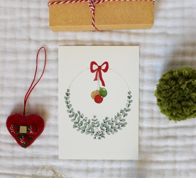 Carte Boules de Noël est une carte postale / décoration murale illustrée à partir d’une aquarelle. Toutes les aquarelles sont réalisées par Marion, la créatrice de la carte du Renard. Les motifs sont réalisés à l’aquarelle puis numérisés et imprimés sur un papier 300g/m², légèrement texturé, verso inscriptible.