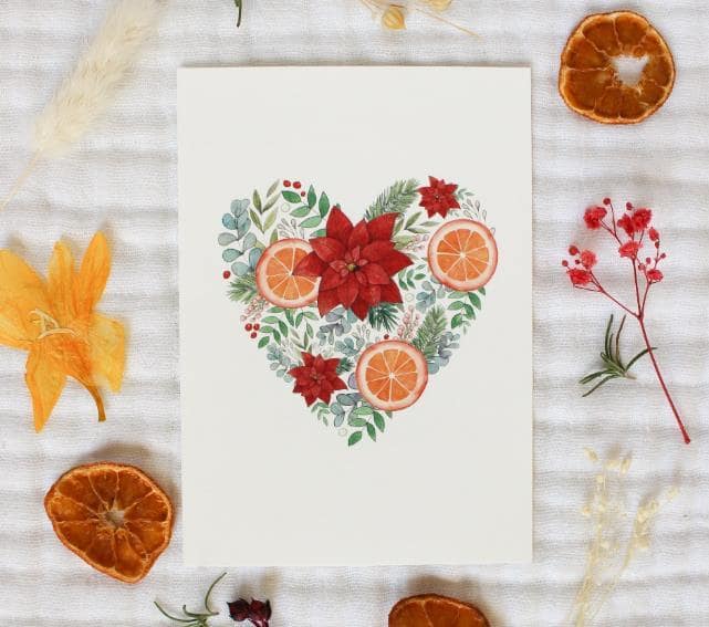 Carte coeur Noël est une carte postale / décoration murale illustrée à partir d’une aquarelle. Toutes les aquarelles sont réalisées par Marion, la créatrice de la carte du Renard. Les motifs sont réalisés à l’aquarelle puis numérisés et imprimés sur un papier 300g/m², légèrement texturé, verso inscriptible.