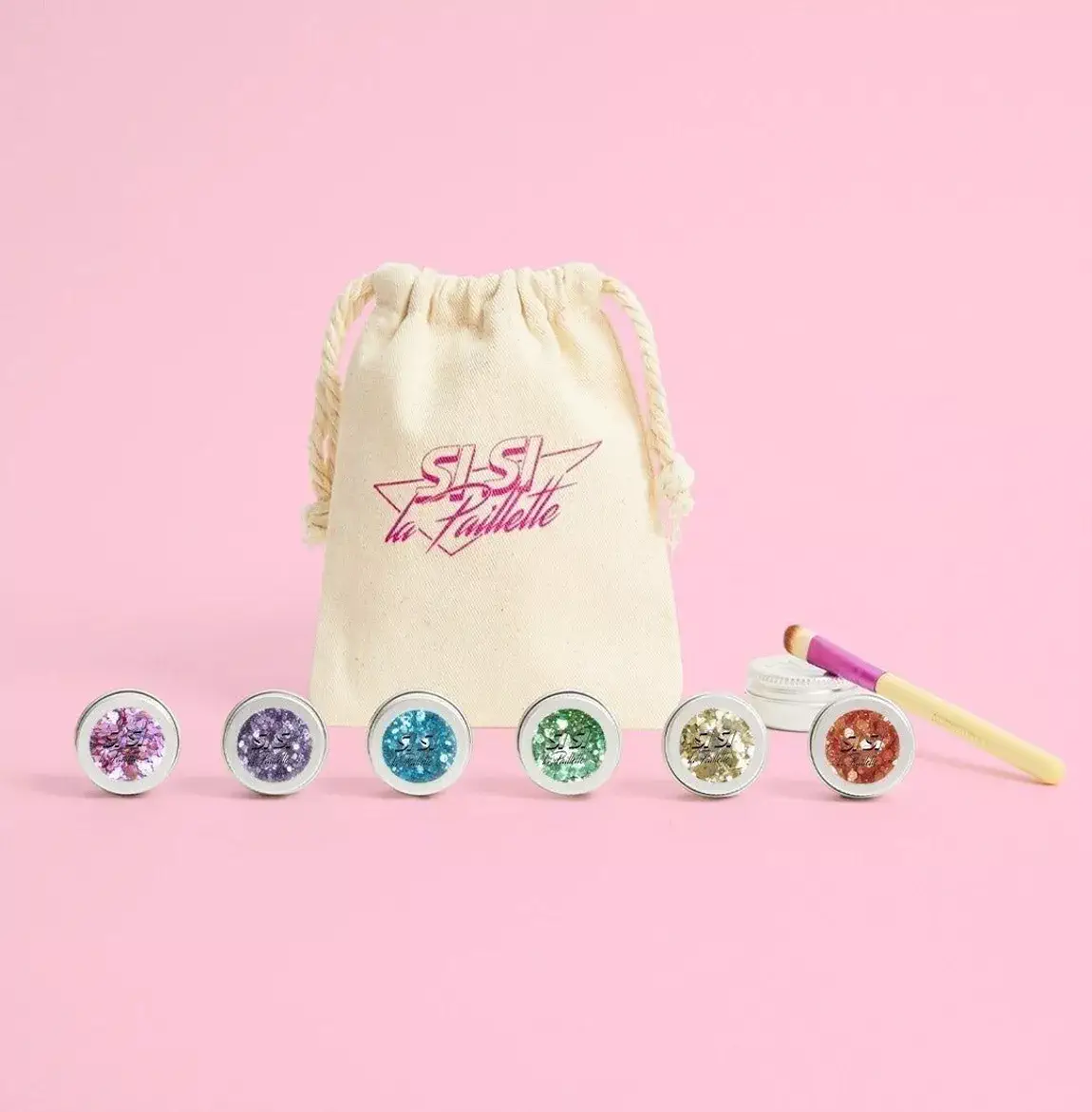 En plus des paillettes, vous y retrouverez tout le nécessaire pour les appliquer : un pinceau en bambou, notre baume applicateur karité et une jolie pochette en coton bio pour tout transporter.