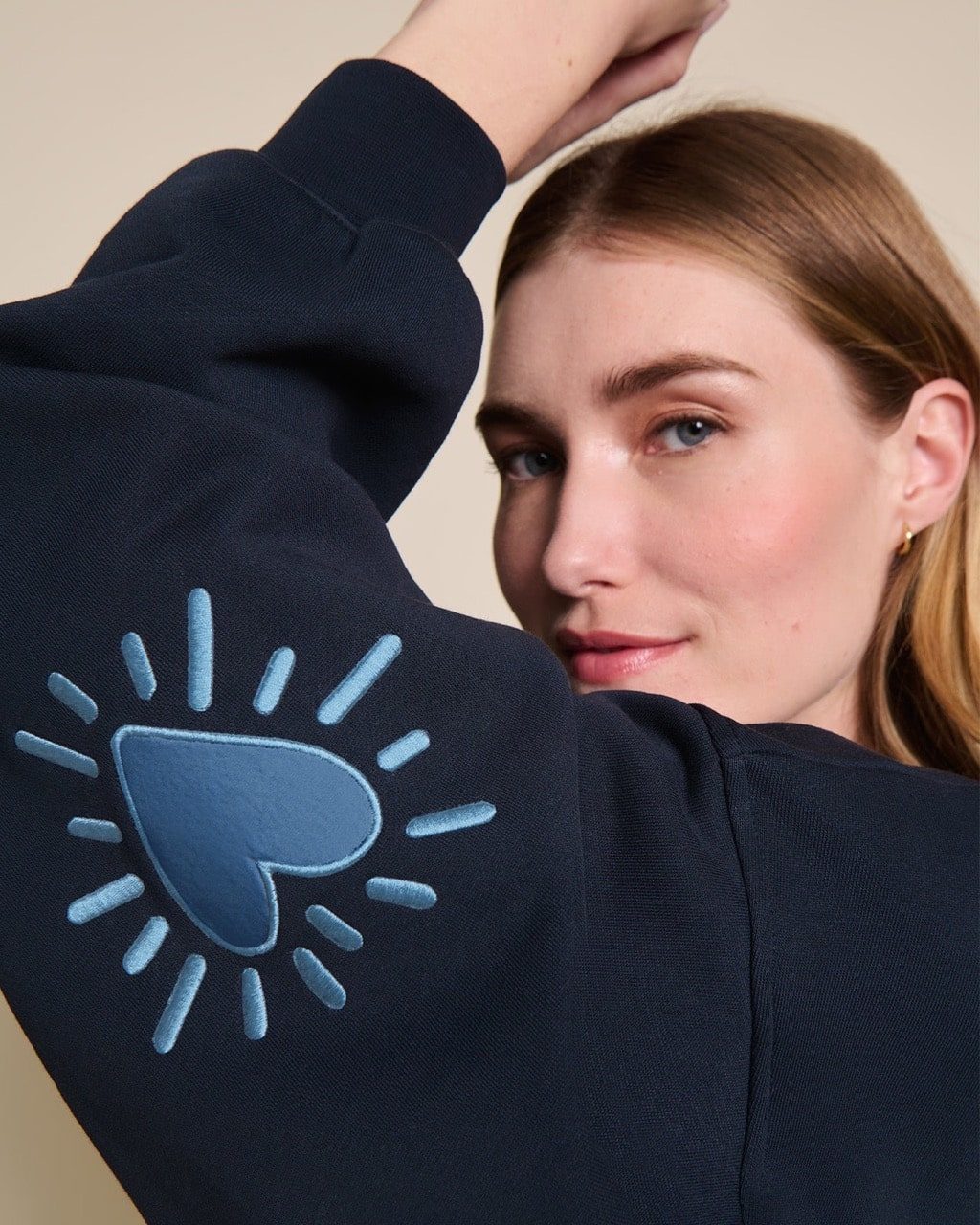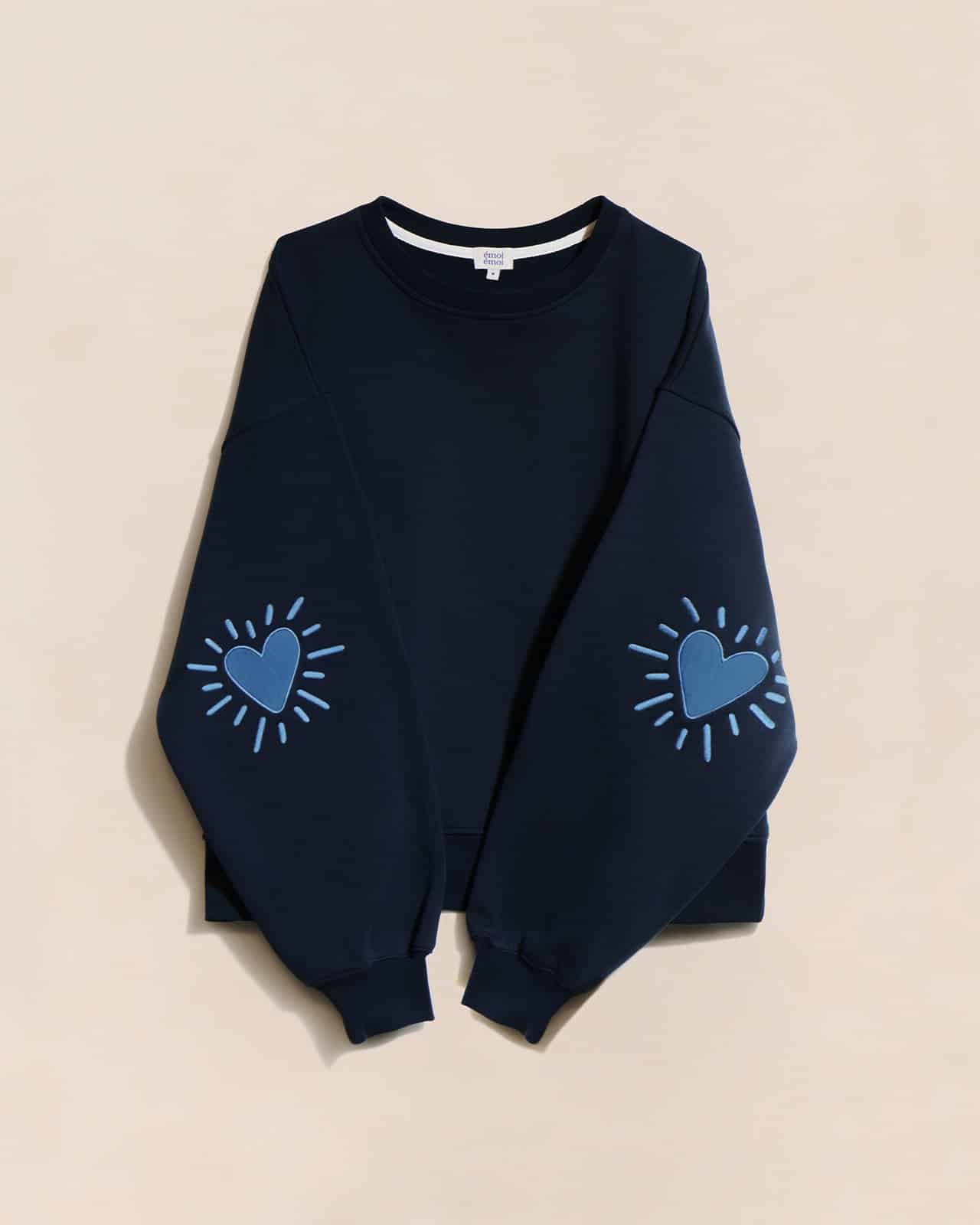 Le sweat Cœur solaire – Bleu femme avec coudières en coton bio – crème