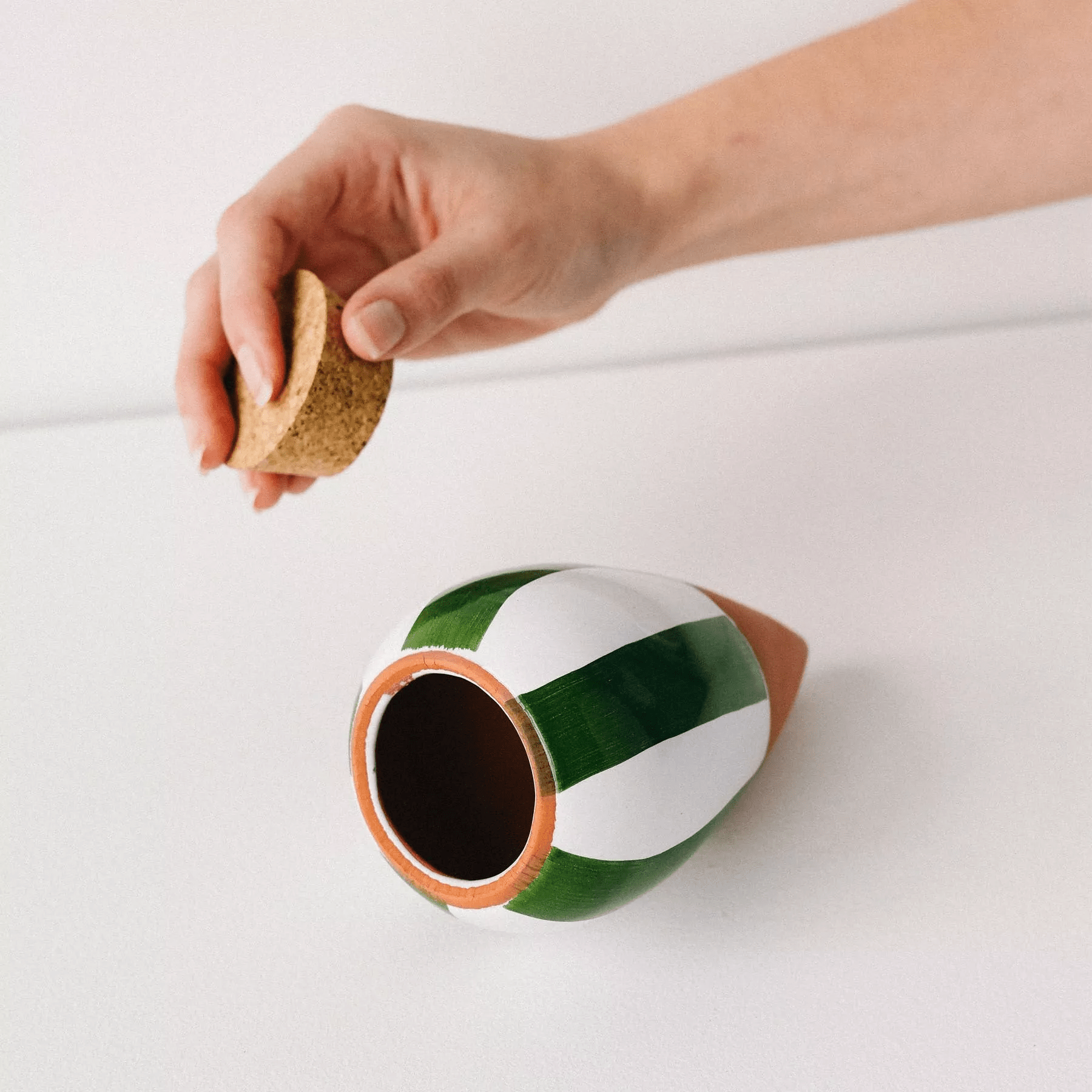 OLLA – rayé vert et blanc est fabriqué à la main au Portugal, près de Leiria, plus précisément dans les ateliers d’Ana et Vitor. Ces artisans travaillent l’argile depuis maintenant 4 générations. Les bouchons de liège proviennent de forêts de chênes-lièges protégées et sont transformés en France.